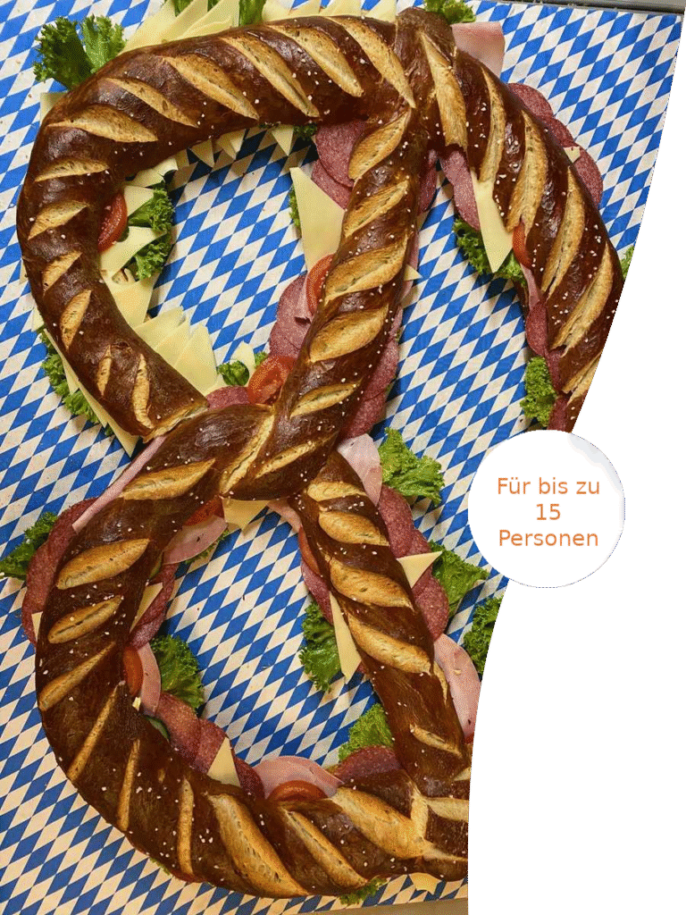 Unsere belegte Riesenbreze und der Laugenzopf sind beliebte Hingucker für Feiern, Feste und besondere Anlässe. Individuell nach Wunsch belegt – ob vegetarisch, vegan, mit Käse, Wurst oder Fisch – und jeweils für ca. 15 bzw. 8 Personen geeignet.
