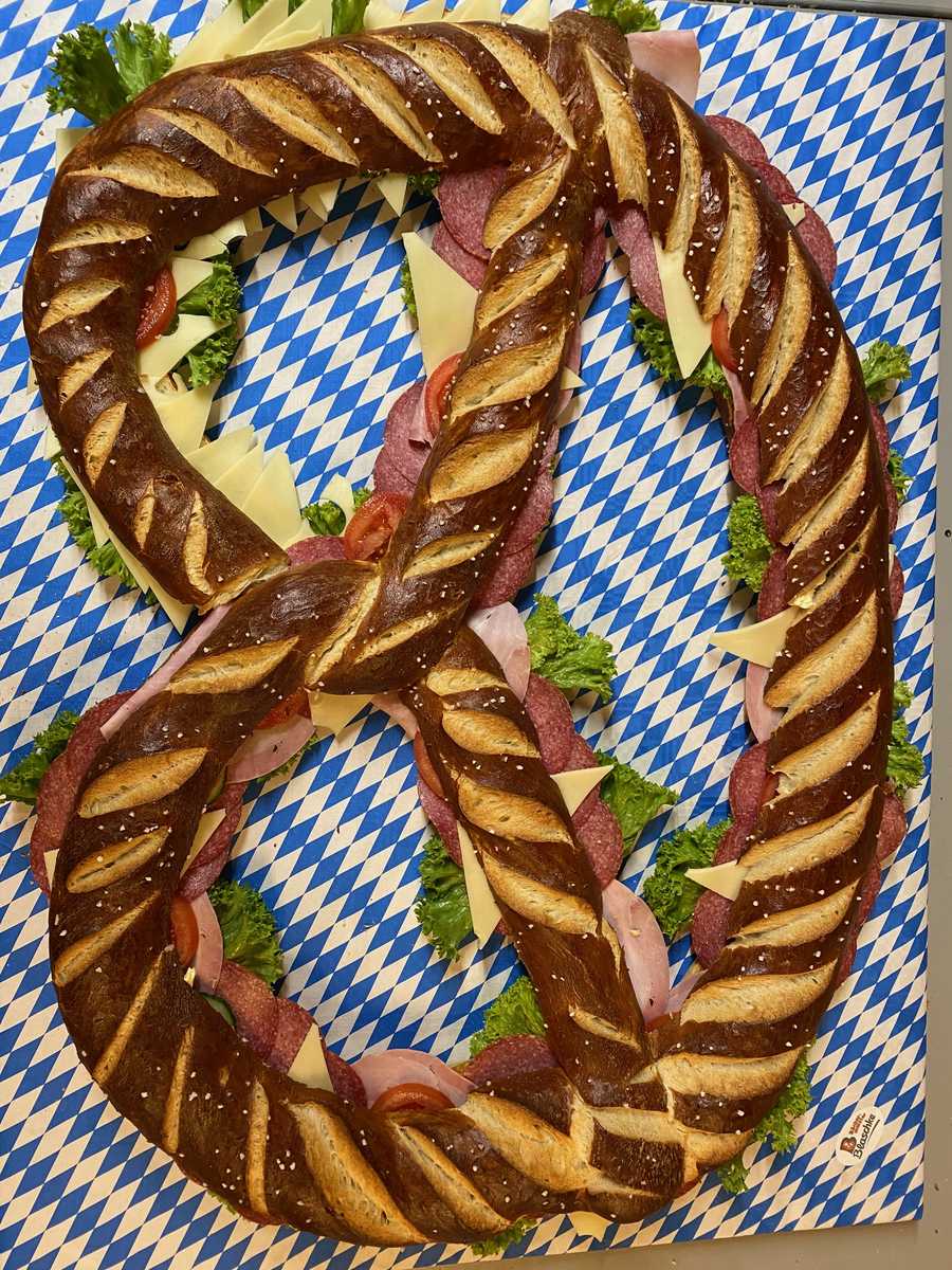Unsere belegte Riesenbreze und der Laugenzopf sind beliebte Hingucker für Feiern, Feste und besondere Anlässe. Individuell nach Wunsch belegt – ob vegetarisch, vegan, mit Käse, Wurst oder Fisch – und jeweils für ca. 15 bzw. 8 Personen geeignet.